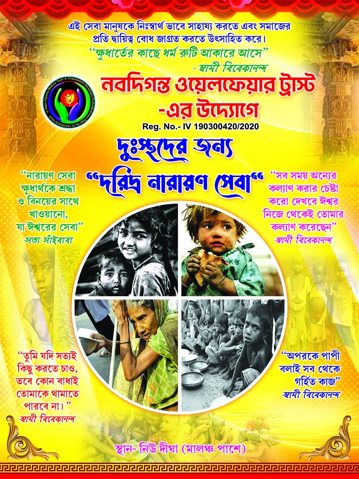 Naba Dighanta Welfare Trust is a charitable, non-political, non-profit social welfare trust founded with the mission of serving disadvantaged communities in West Bengal, India. It was established in 2014 and is registered under the Charitable Trust Act in West Bengal. Its roots lie in grassroots social work, aimed at uplifting poor, orphaned and marginalized individuals without any distinction of religion, caste, or creed.